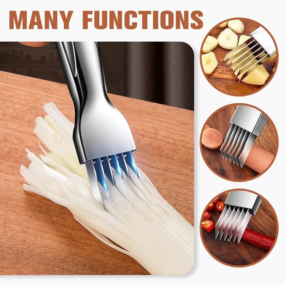 Cuțit special pentru mărunțirea cepei verzi și a legumelor, cu 6 lame ascuțite din oțel inoxidabil, dispuse uniform pentru tăieturi rapide și egale.