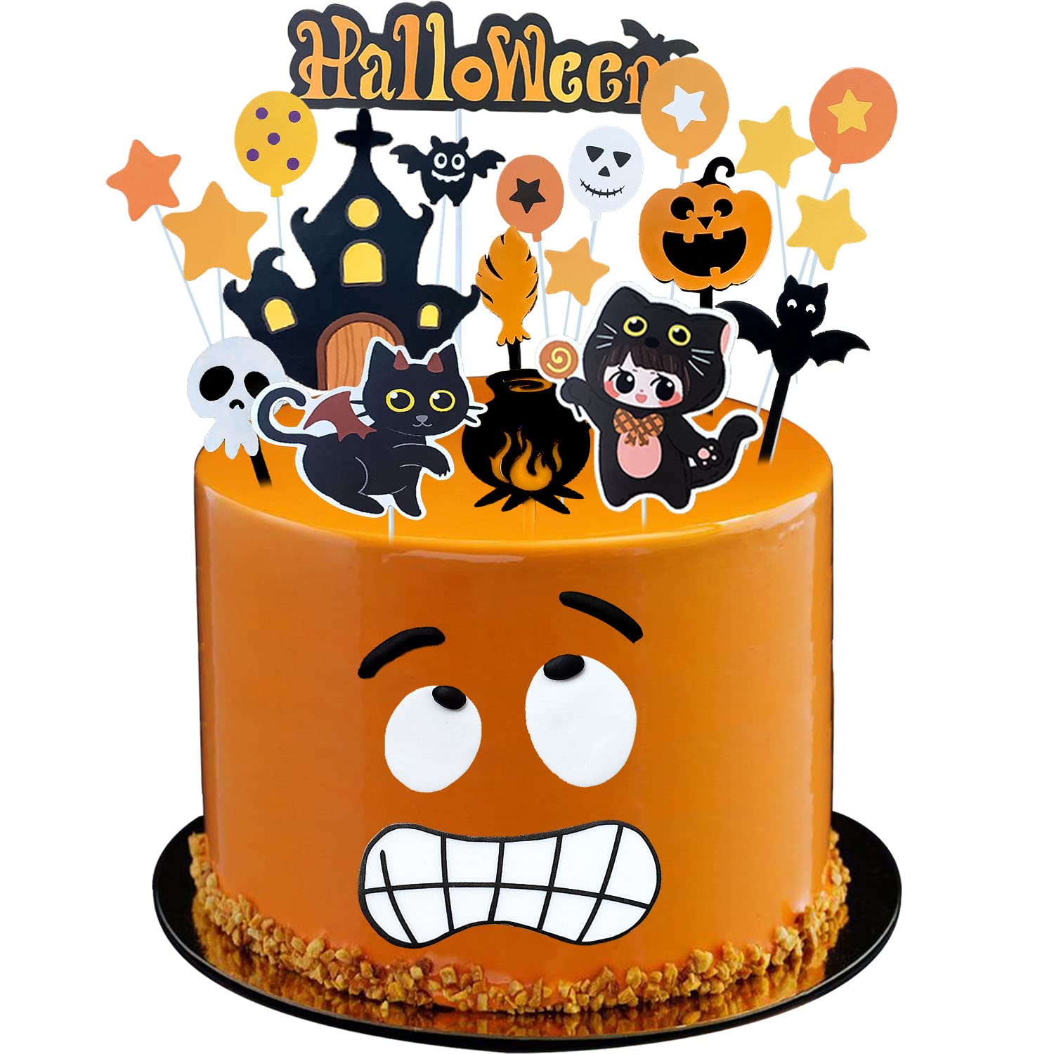 Set de 21 toppere pentru tort și cupcakes, cu modele haioase: fantome, dovleci și emoji funny – perfecte pentru petreceri tematice.